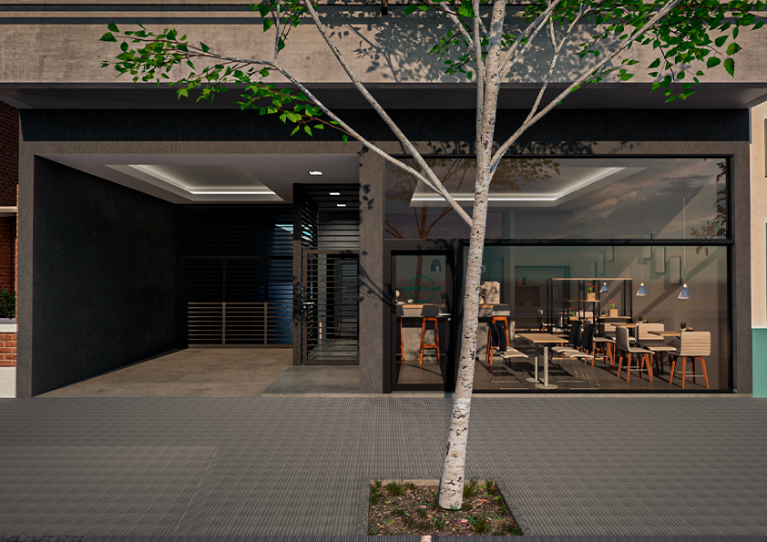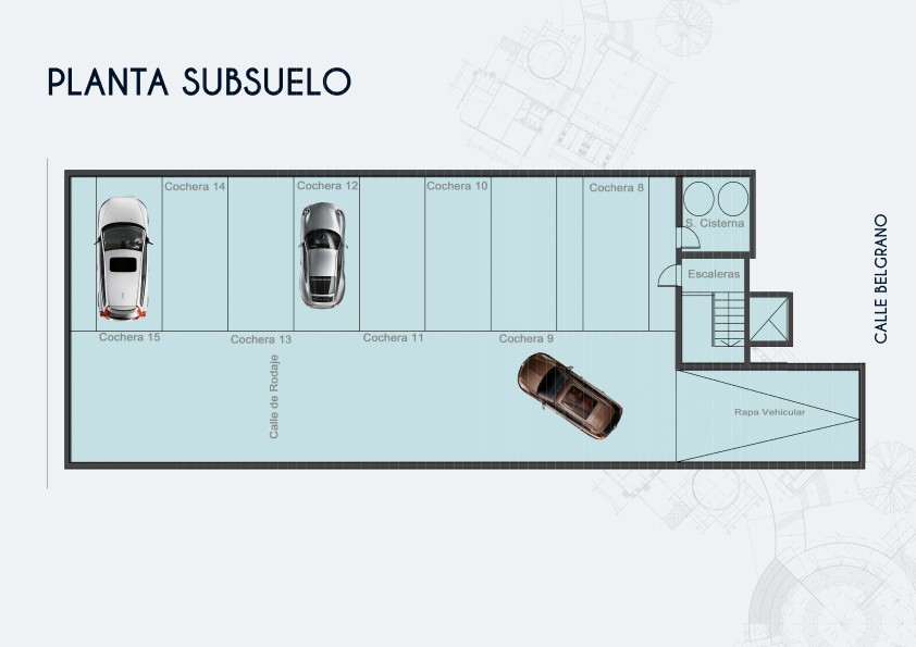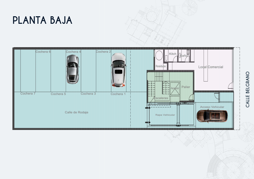 El proyecto se conforma de seis unidades de 73M2, dos unidades por piso, y una unidad de 40m2 en planta baja. Cada unidad cuenta con dos baños y kitchenette. El desarrollo comprende un total de 15 cocheras de 12,5m2 cada una.