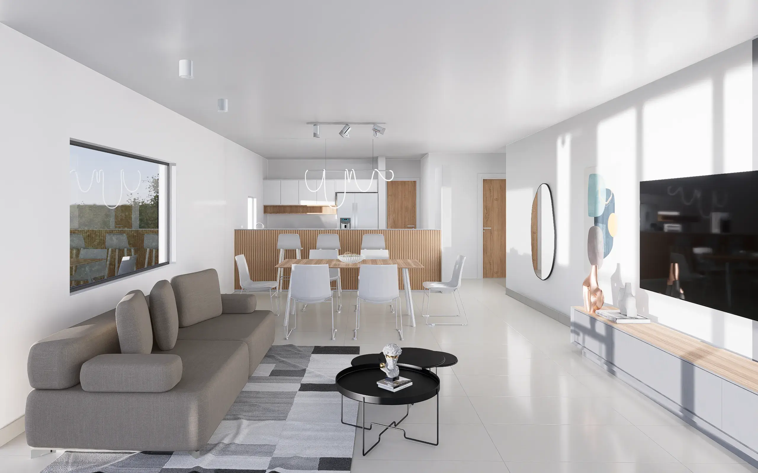 Cada semipiso cuenta con un dormitorio en suite con vista al mar, vestidor y baño independiente, amplio estar comedor con barra, dos dormitorios con vista al pinar del golf y un segundo baño completo. También se destacan sus amplios balcones con acceso desde dormitorio en suite y estar con exclusivas vistas al océano.